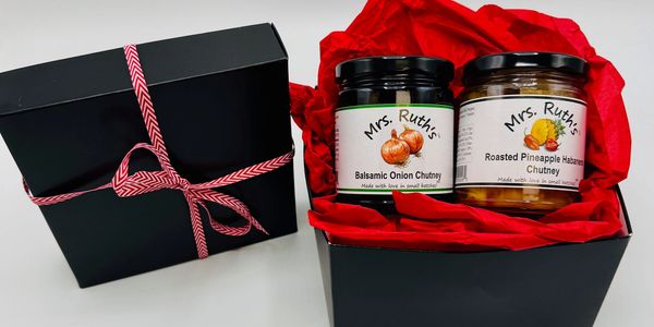 New! Enjoy new chutneys! Each gift box contains 2 yummy 10 ounce jars of our new chutneys - Balsamic Onion and Roasted Pineapple Habanero. These delicious chutneys are ready for holiday entertaining - perfect partners for cheese, charcuterie or toppers for grilled proteins!